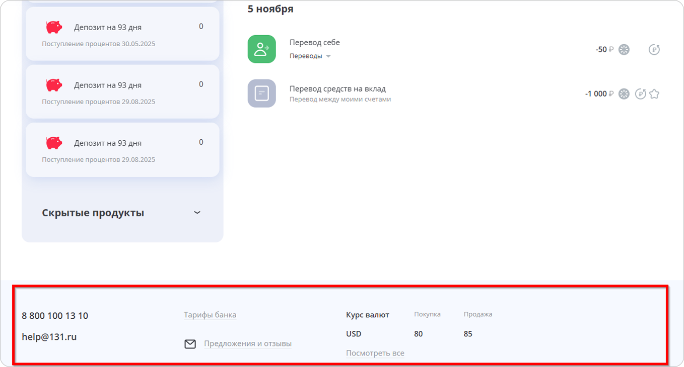 - Блок с контактными данными (ссылкой обратной связи, телефоном поддержки) и информацией о текущих курсах валют.