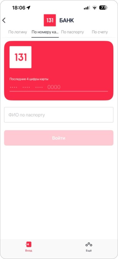 Введите последние 4 цифры номера карты, свое ФИО и нажмите Войти.