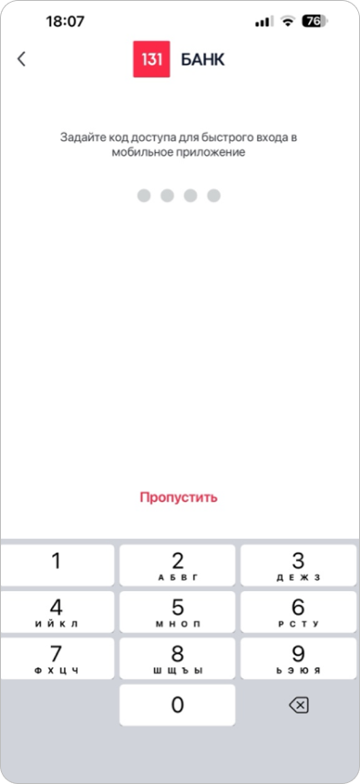 Придумайте PIN-код — 4-значную комбинацию для быстрого входа в приложение. В дальнейшем вы сможете входить по PIN-коду либо настроить вход по отпечатку пальца или геометрии лица (Face ID).