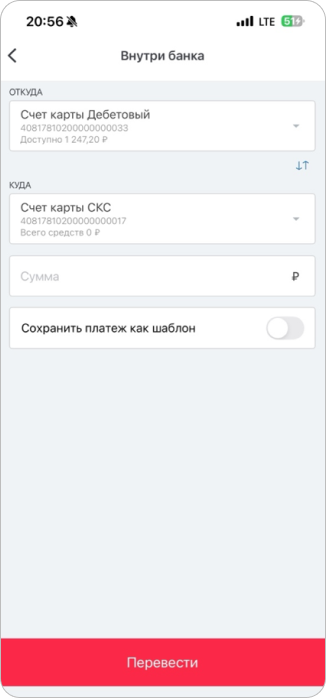 Вы можете быстро и безопасно переводить деньги между своими картами и счетами, в том числе в другие банки.