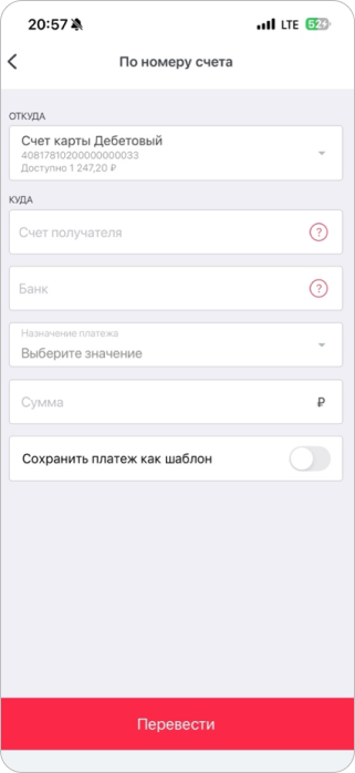 - Если вы хотите сохранить перевод для повторного использования, нажмите переключатель Сохранить платеж как шаблон и укажите название шаблона. Сохраненный шаблон будет доступен в разделе Шаблоны.